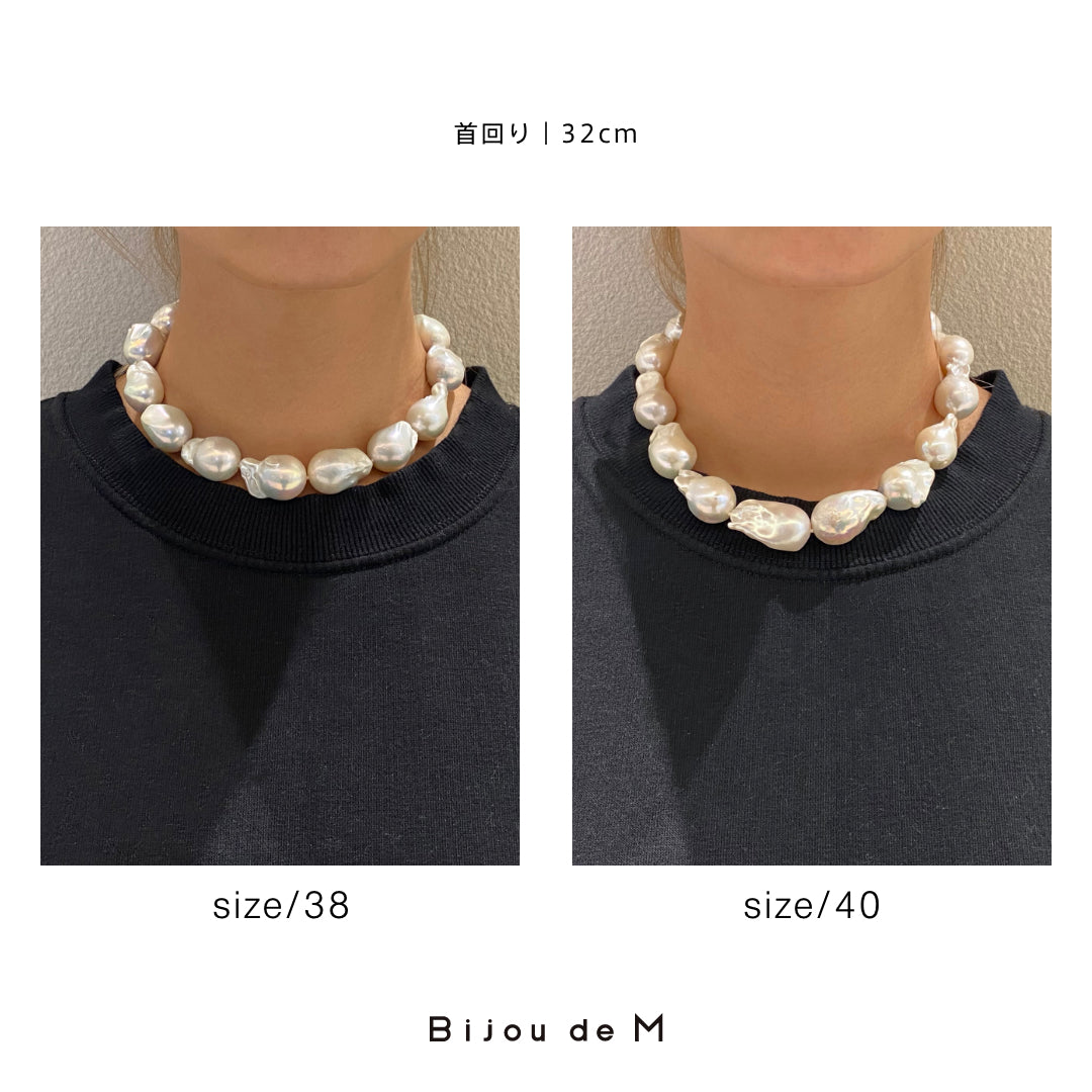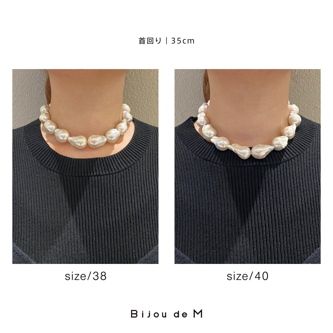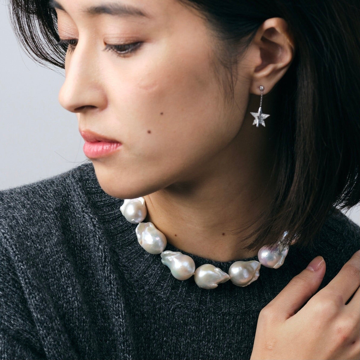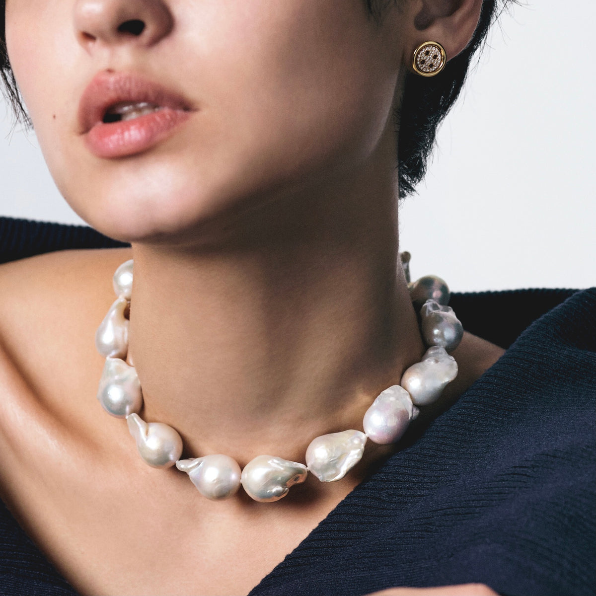 同じものが二つとないバロックパールを連ねたネックレス。大きなパールがフロントにくるように、中心がずれないセッティングとなっています。(個体差はございます)目を奪うような圧倒的な存在感がコーディネートの主役に。パーティーシーンでも活躍するユニークピースは一つは持っておきたいアイテムです。
