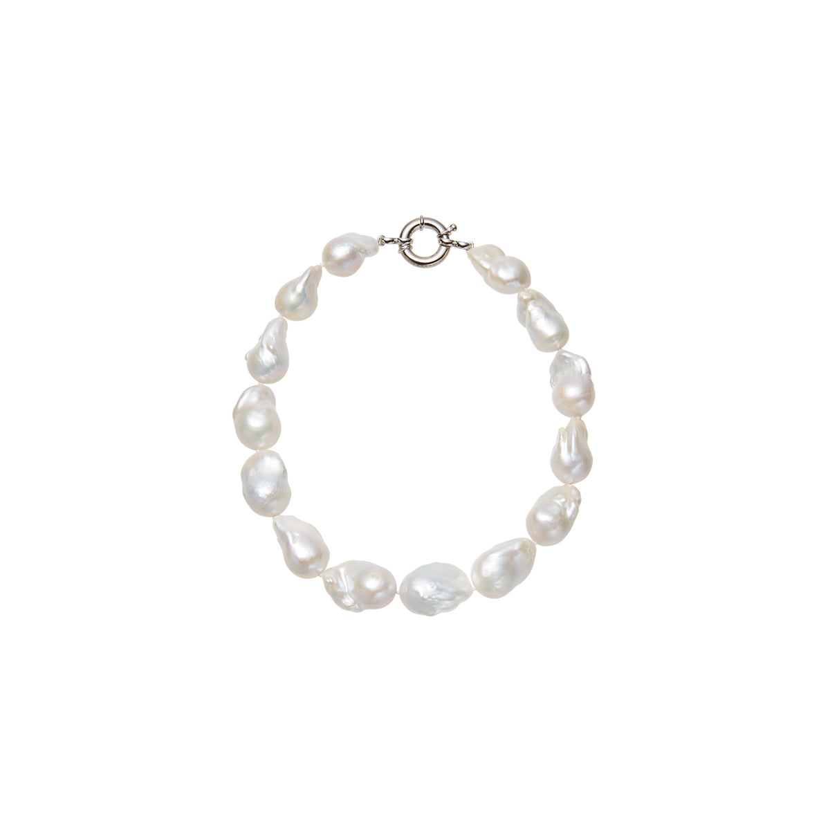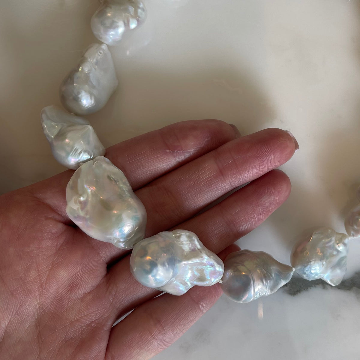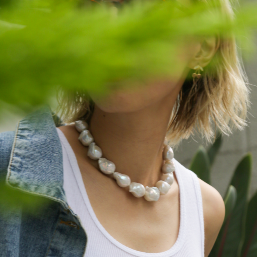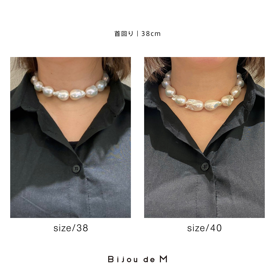 同じものが二つとないバロックパールを連ねたネックレス。大きなパールがフロントにくるように、中心がずれないセッティングとなっています。(個体差はございます)目を奪うような圧倒的な存在感がコーディネートの主役に。パーティーシーンでも活躍するユニークピースは一つは持っておきたいアイテムです。
