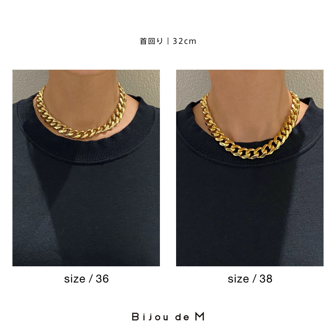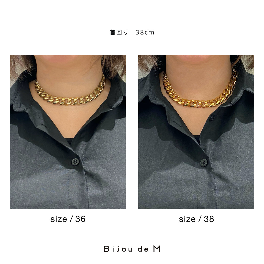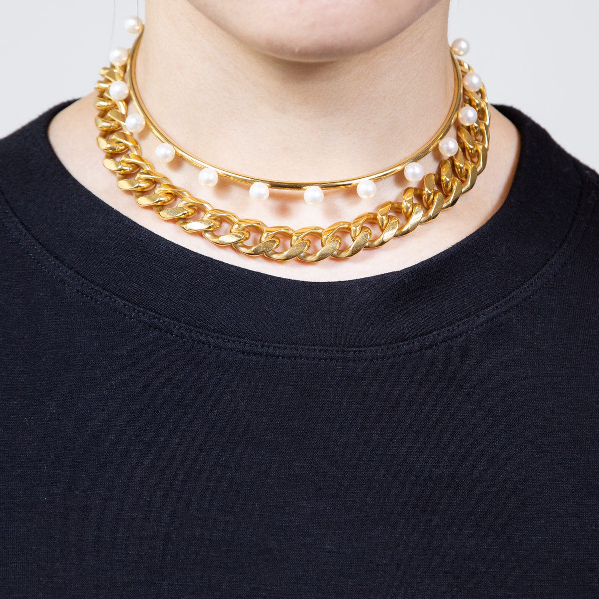 がつんとインパクトのあるチェーンチョーカー。ヘビロテアイテムとして人気です。パールのチョーカーと重ね付けをすると、甘めカジュアルに。