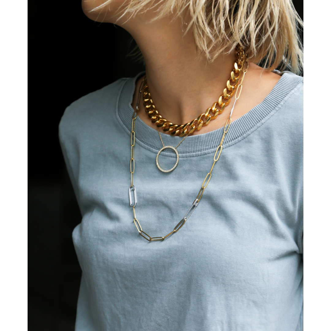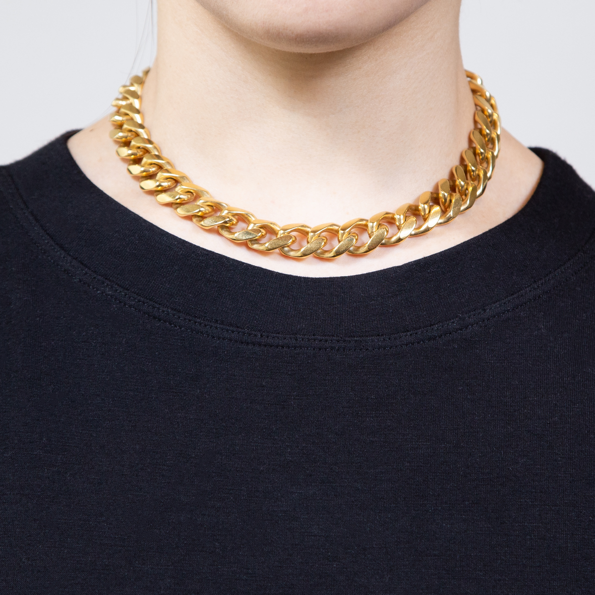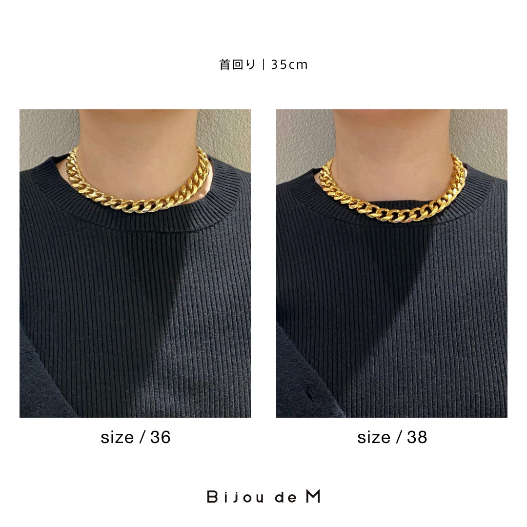 がつんとインパクトのあるチェーンチョーカー。ヘビロテアイテムとして人気です。パールのチョーカーと重ね付けをすると、甘めカジュアルに。
