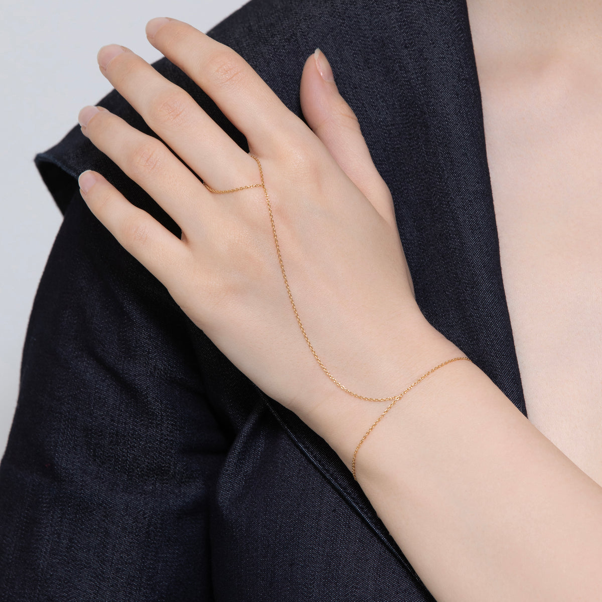 K18イエローゴールドの細いチェーンが指を美しく魅せてくれます。