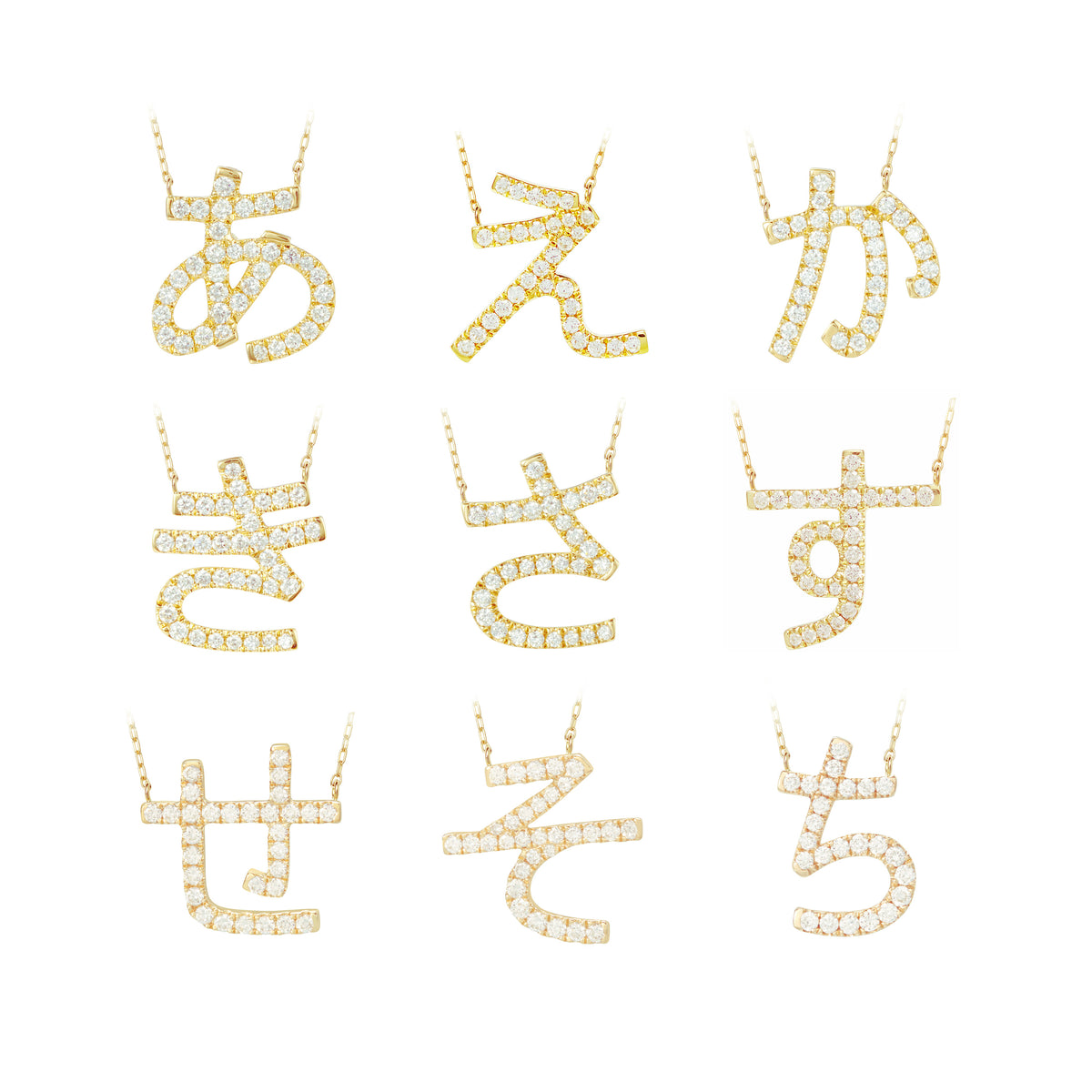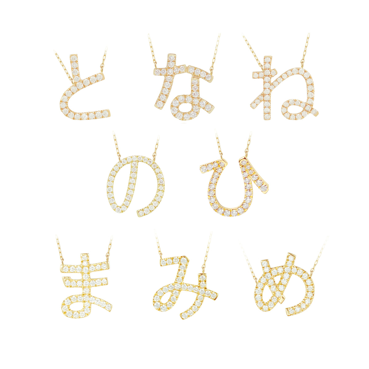 こんなデザイン無かった!ビジュードエムのアイコンジュエリーの一つとも言える「ひらがな」ネックレス。発売以来ベストセラーのアイテムです。丸みのあるフォントがどの文字もかわいく、1つでも存在感を放ちますが、2つ3つと並べて名前や言葉にして身につけたくなるようなリュクスな遊び心溢れるジュエリーです。ダイヤモンドタイプはより華やかで、その存在感が首元で一層際立ちます。