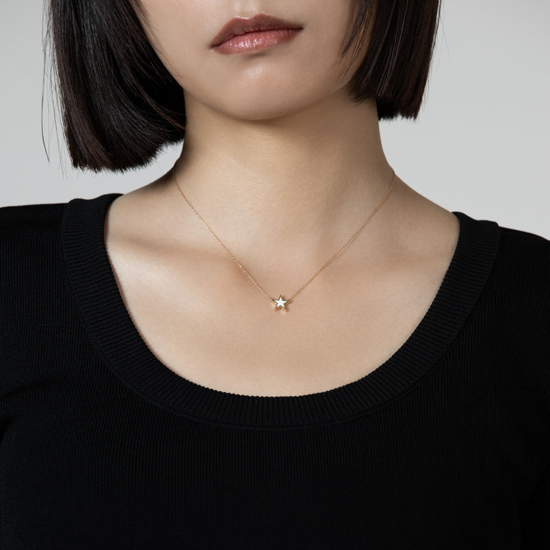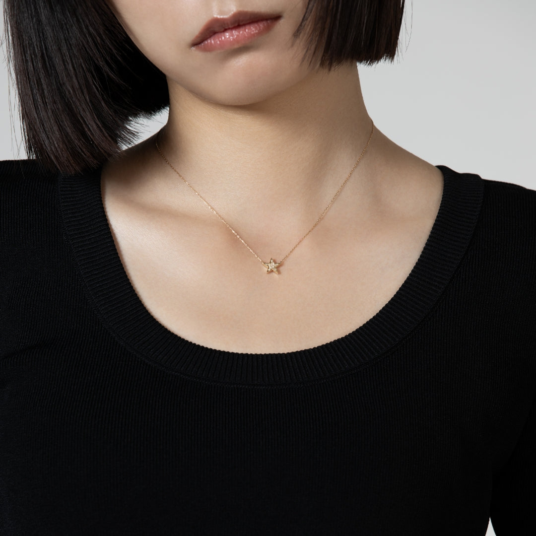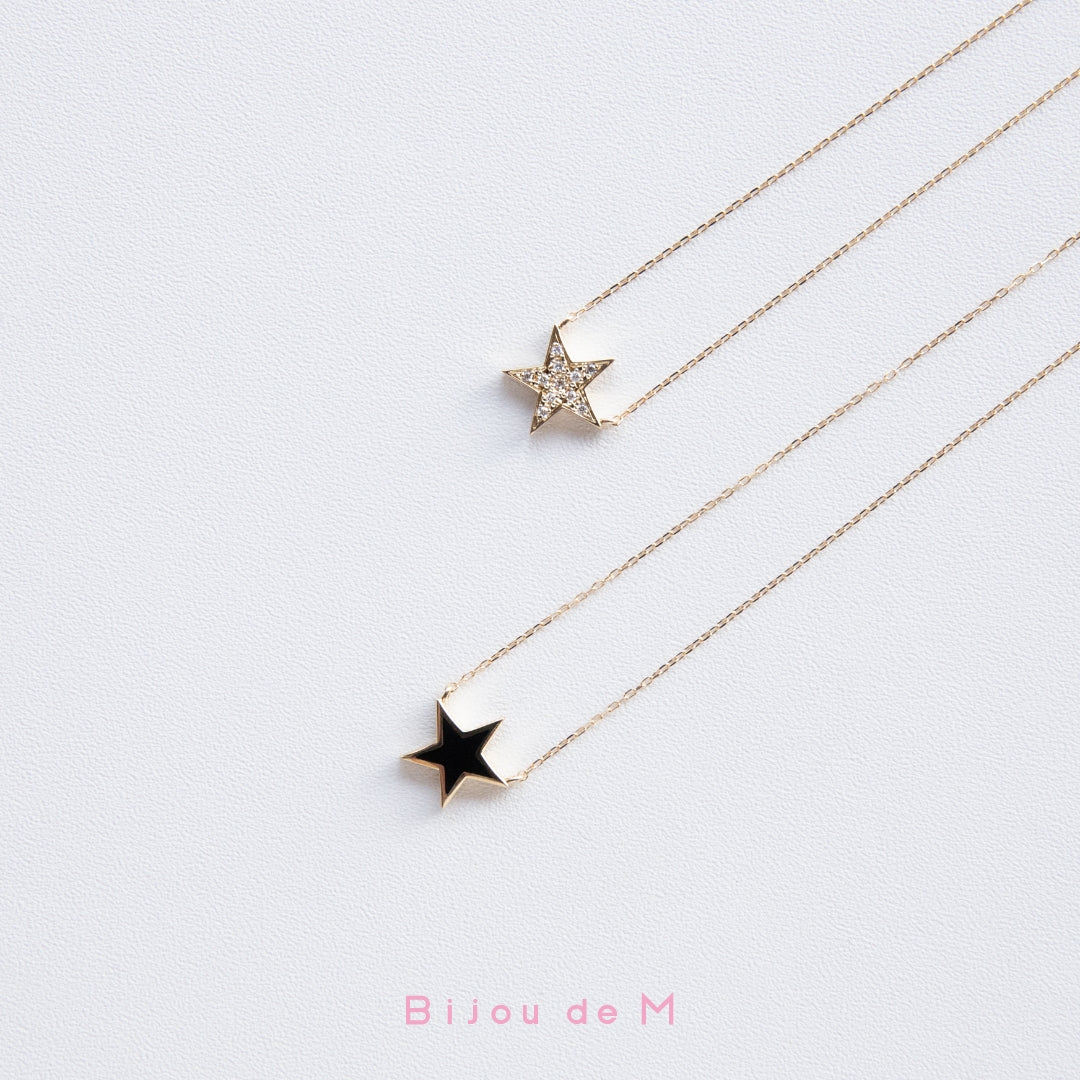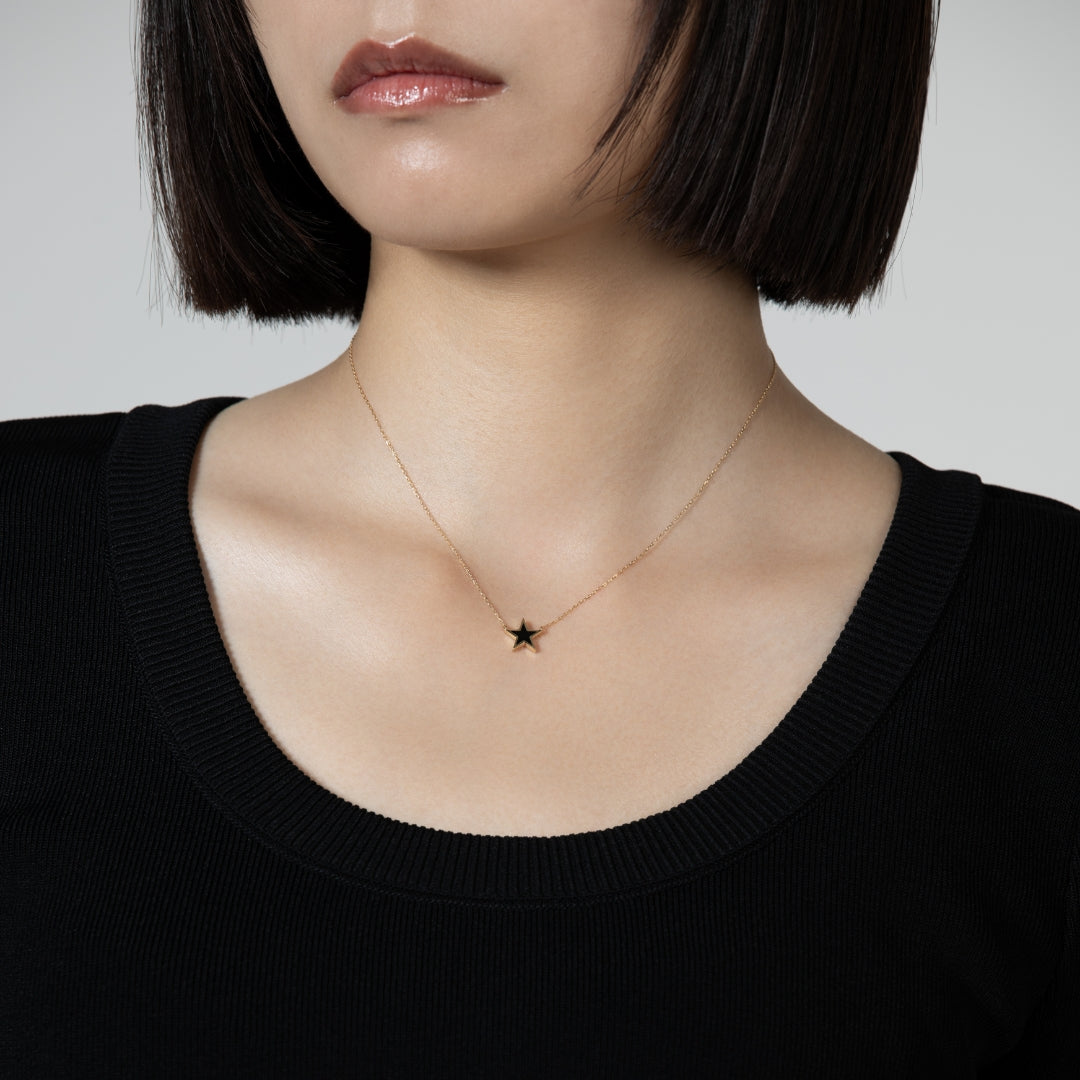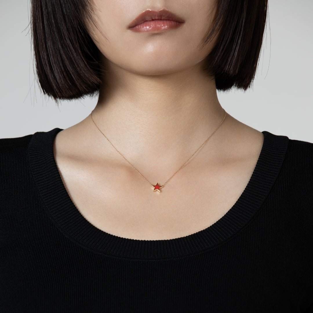 毎日でもつけたくなるかわいいデザイン!定番のハートと、今年のラッキーモチーフでもあるスターのネックレスです。チェーンの先に輝くのは、赤、白、黒のスターとダイヤモンドのスター。両面使える仕様になっております。K18イエローゴールド、ダイヤモンドと艶やかなカラーのコンビネーションが、胸元にキラリとかわいさを演出します。ベーシックで毎日つけられるデザインで、シーンやコーデを選ばずに、ずっと身につけられるデザインです。単品使いはもちろん、お手持ちのネックレスとの重ね付けもお楽しみいただけます。