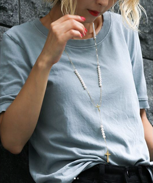 デザイナーが幼少期から愛用していたロザリオをパールで再現しました。