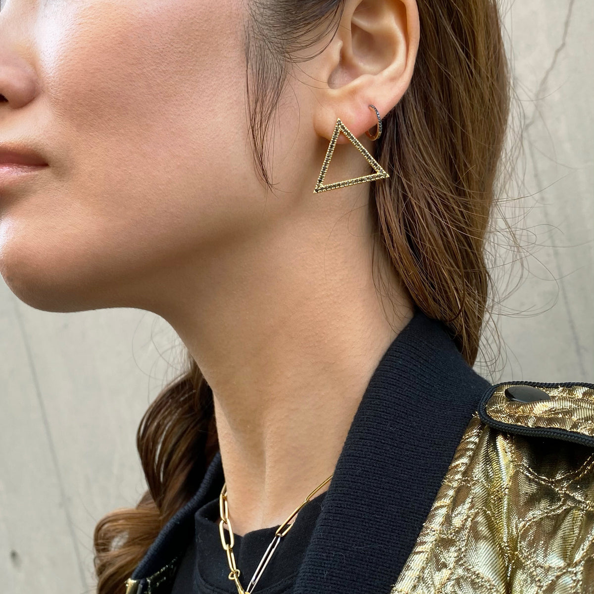 シンプルモダンな○△□シリーズは洗練されたフォルムと、ブラックダイヤモンドのクールな輝きが耳元で存在感を放ちます。同シリーズのプチサイズと合わせたり、左右モチーフ違いで揃えるのがおすすめです。※ピアスは片耳販売となります。